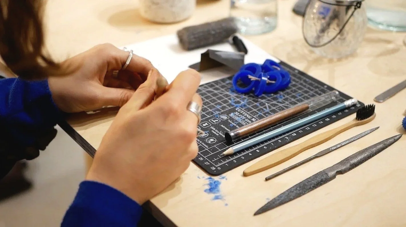 Mollie regularly runs wax ring workshops in various locations around Brighton/Hove and surrounding Sussex. She holds intermit classes where the students come and create their own bespoke ring through the ancient method of lost wax casting. In the workshops students are taught different techniques using various tools to explore and experiment with mark-making, forming shape and surface texture. After the class the pieces are then sent to be cast in Sterling recycled silver (or recycled gold- On request)